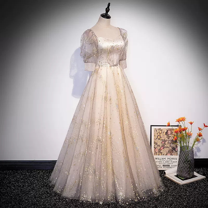 A line Short Puffy Sleeves Tulle Prom Dresses SH114