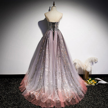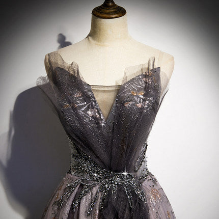 A line Short Sleeves Long Tulle Prom Dresses SH160