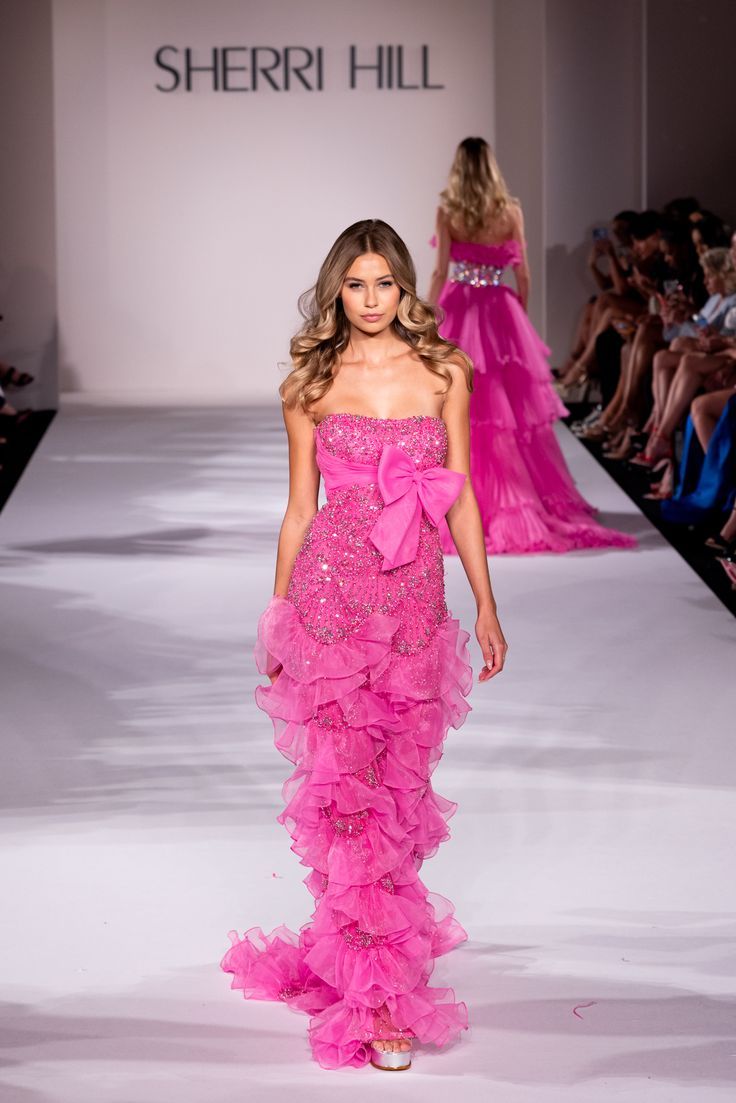 Barbie Pink Bow Stunning Sheath Ruffle Organza Sequin Long Prom Dress Evening Dress SH3457