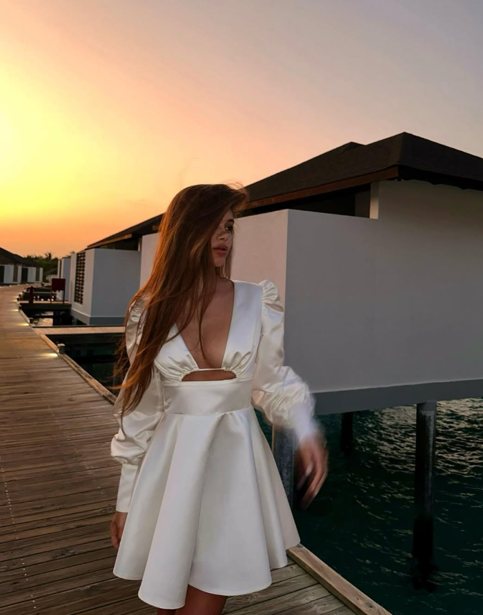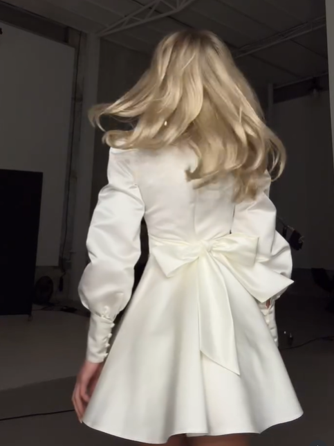 Black Bow A Line Long Sleeve V Neck Satin Short Homecoming Dress Cocktail Dress Outfits SH3563