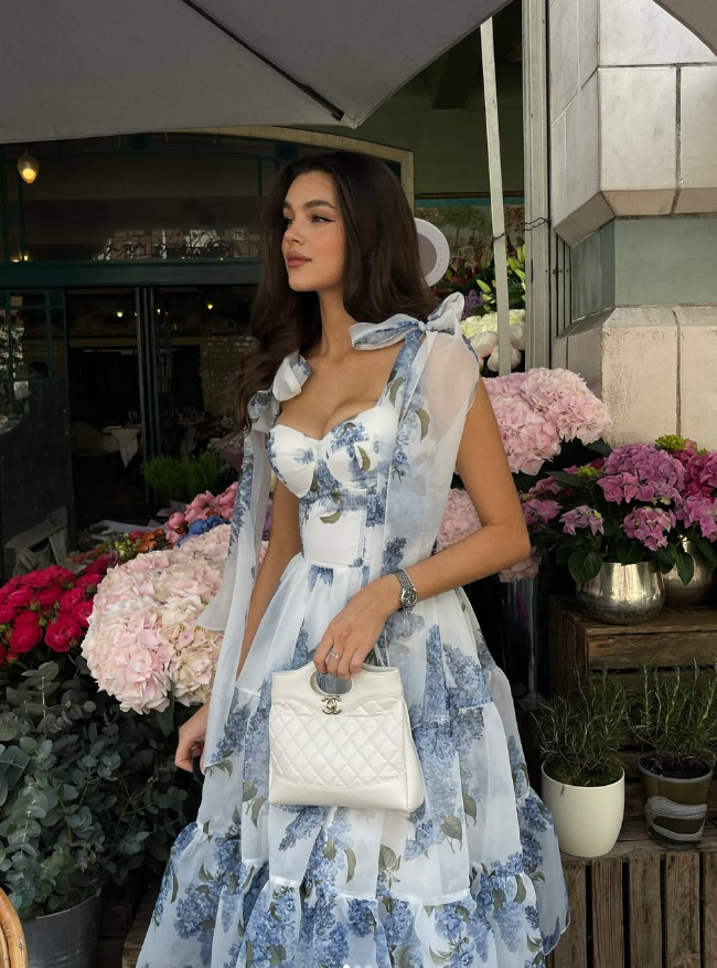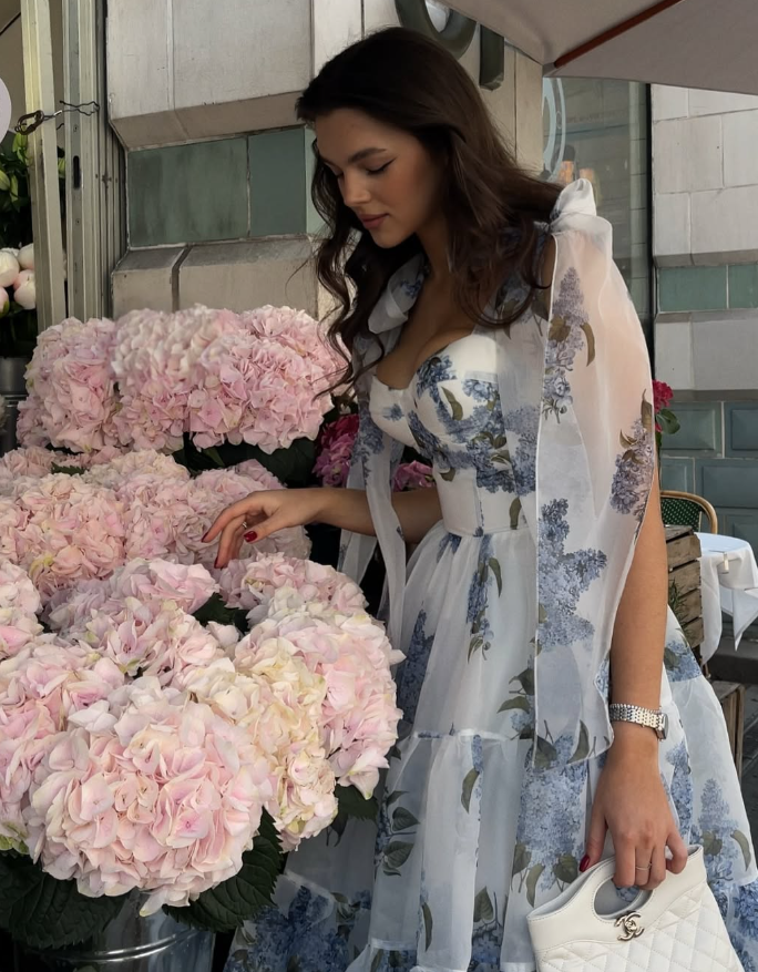 Blue Print Floral A Line Spaghetti Strap Tea Length Chiffon Homecoming Dress Cocktail Dress Outfits SH3564