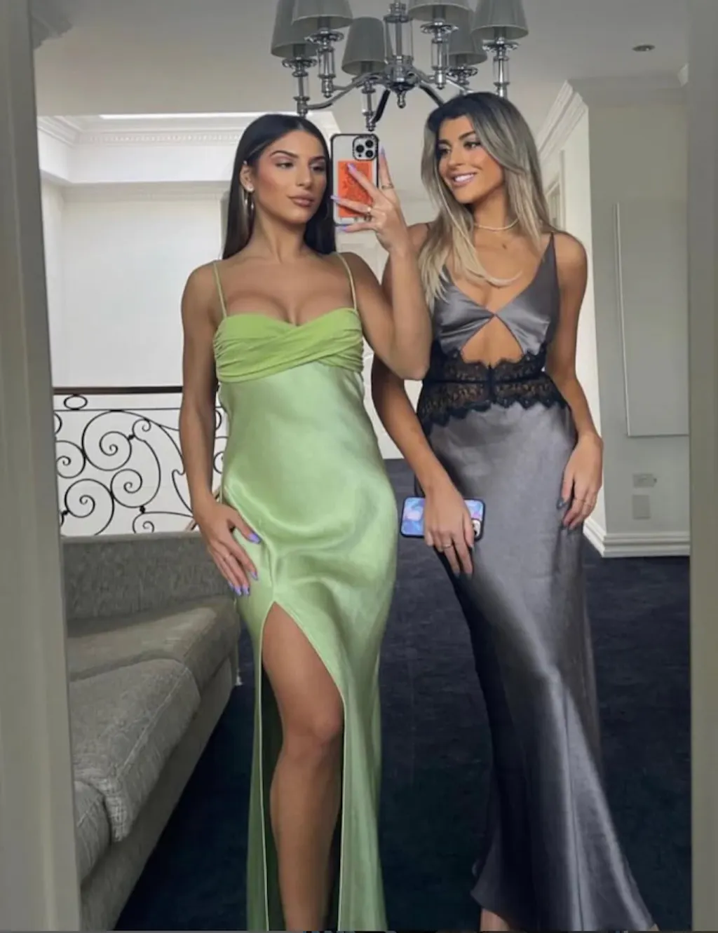 Charming A Line Spaghetti Straps Green Satin Long Prom Dress Evening Dress with Slit SH1952