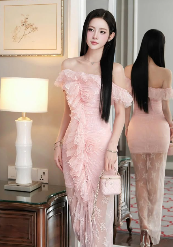 Classic Sheath Off the Shoulder Pink Lace Long Prom Dress Evening Dress SH4670