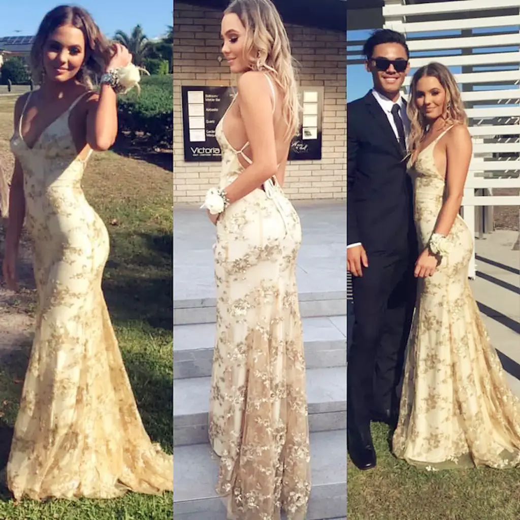 Sexy Mermaid Gold Sequin Tulle Long Backless Prom Dress Evening Dress D1074