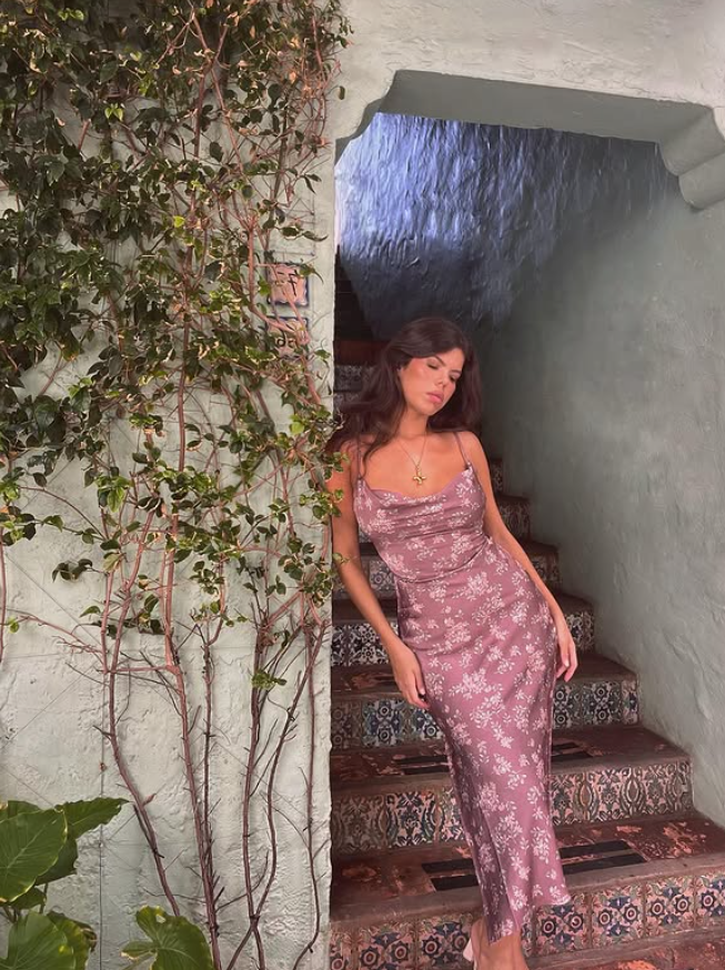 Dark Purple Sheath Spaghetti Strap Print Floral Satin Prom Dress Party Dress SH4604