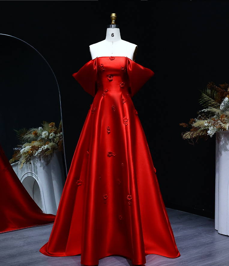 Elegant A Line Off the Shoulder 3D Flower Red Satin Prom Dress Evening Dress SH2378