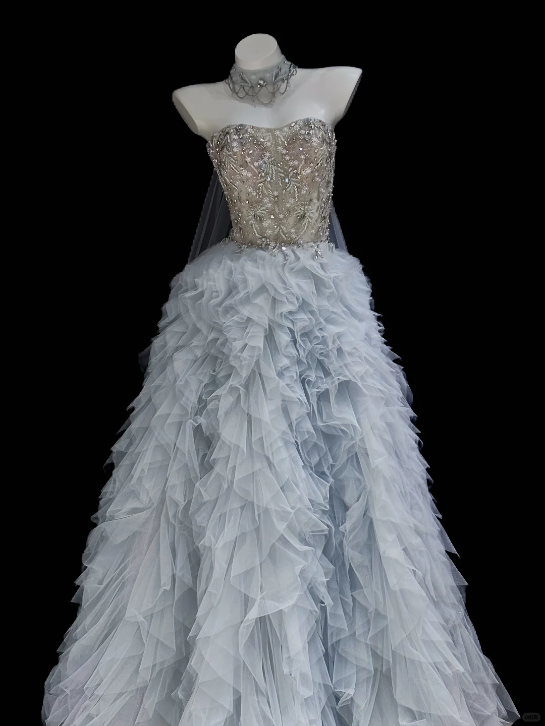 Elegant A Line Sweetheart Neck Beaded Blue Tulle Long Prom Dress Evening Dress SH5006