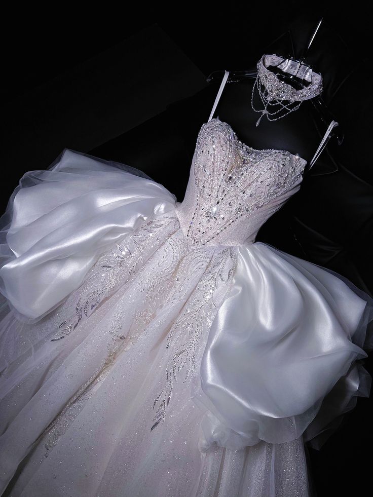 Elegant Exquisite Ball Gown Strapless Beaded Sequin Tulle Satin Prom Dress Wedding Dress SH3638