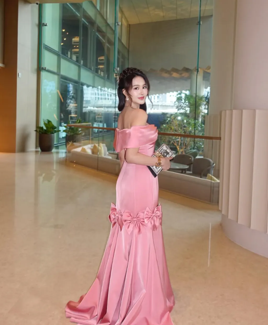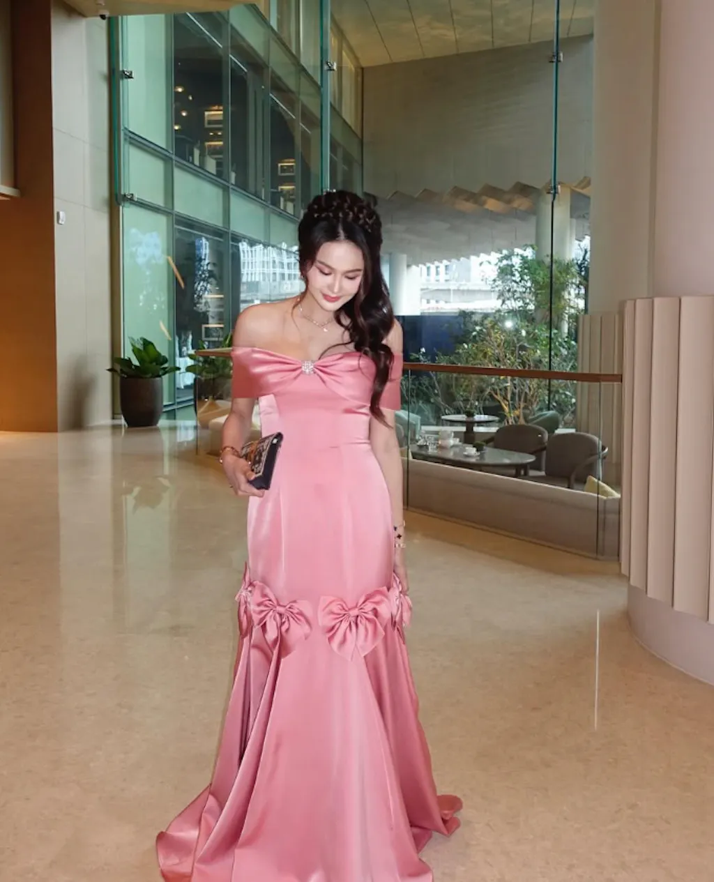 Elegant Mermaid Off the Shoulder Bow Pink Satin Long Prom Dress Evening Dress SH1933