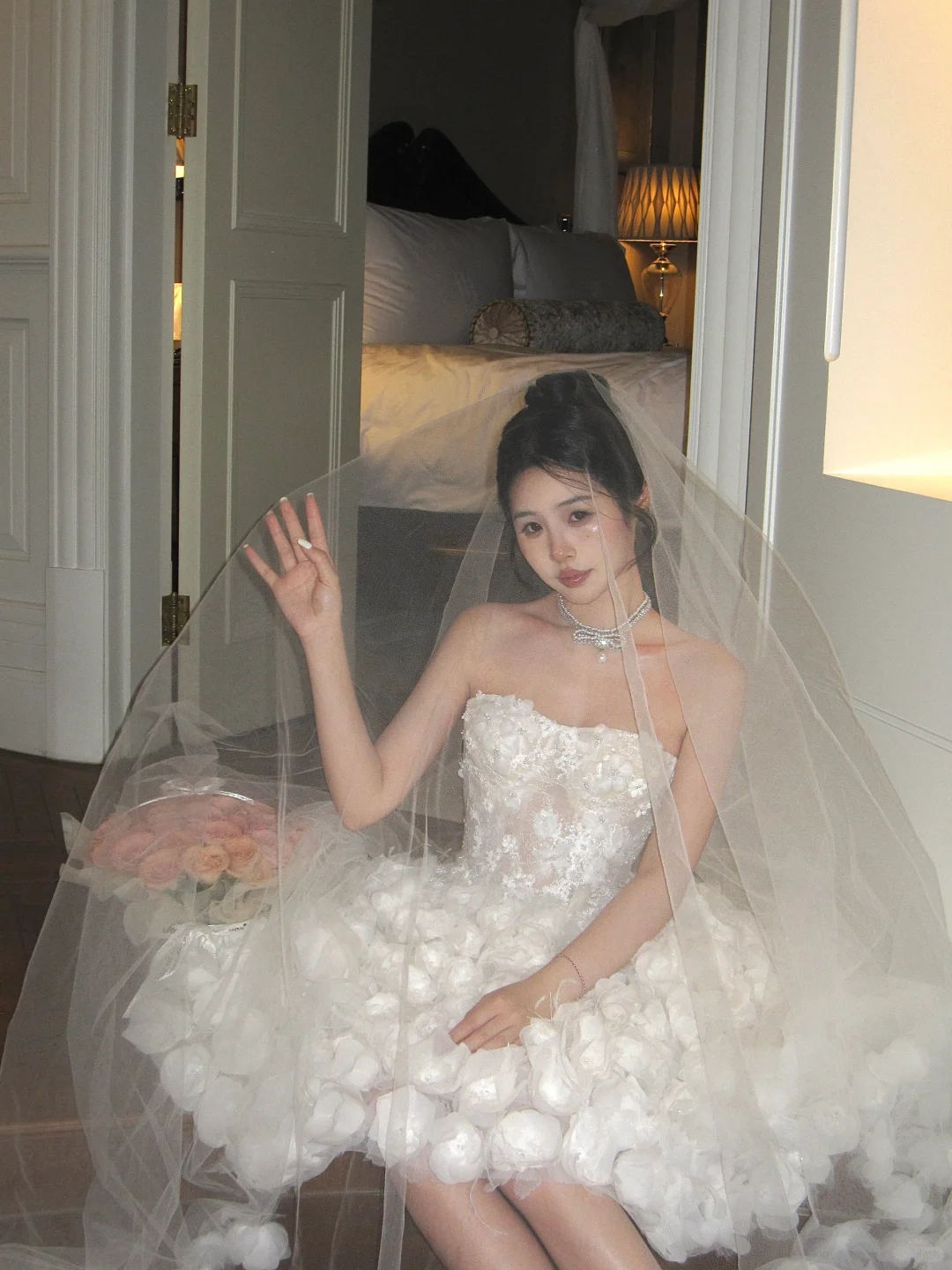 Exquisite 3D Floral A Line Strapless White Tulle Short Cocktail Dress Homecoming Dress SH3403