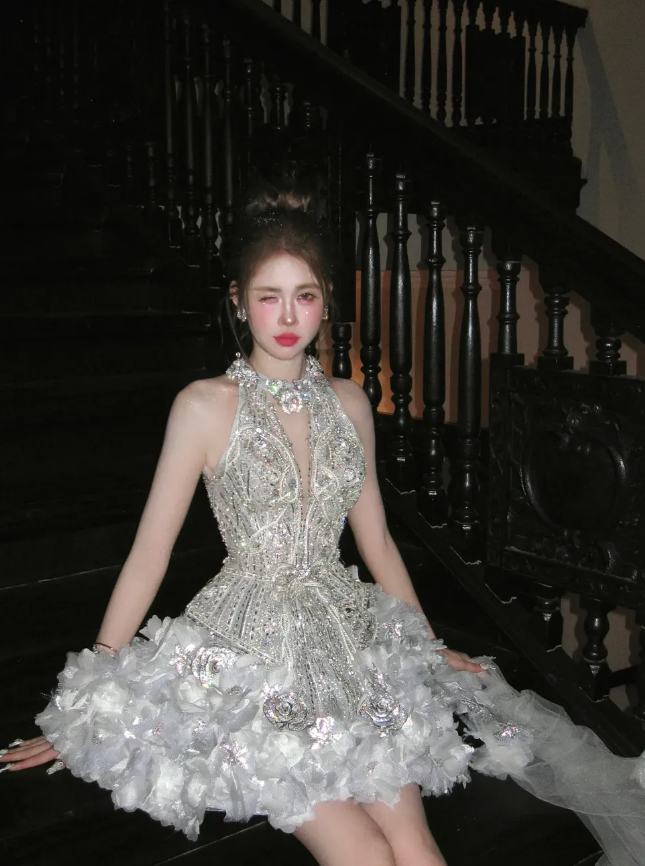Gorgeous A Line V Neck Silver Beaded Flower Tulle Short Homecoming Dress Cocktail Dress SH3358