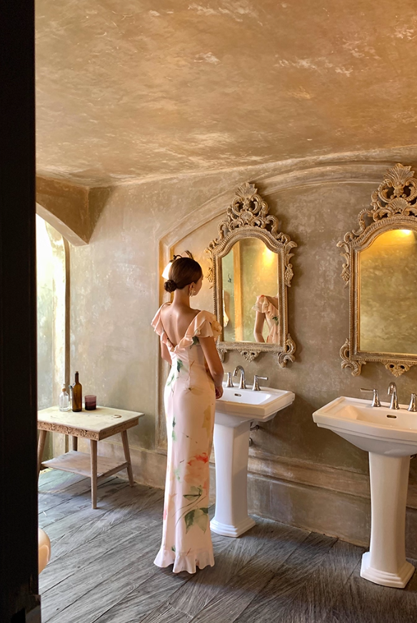 Light Pink Mermaid V Neck Print Floral Ruffle Chiffon Summer Dress Party Dress Outfits with Slit SH4174