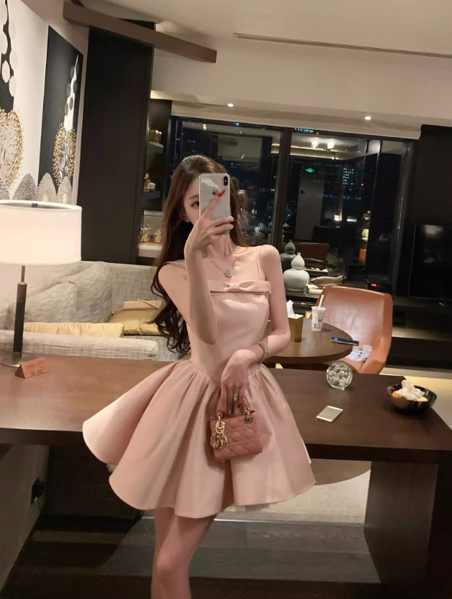 Pink Bow A Line Spaghetti Strap Satin Short Homecoming Dress Cocktail Dress SH3384