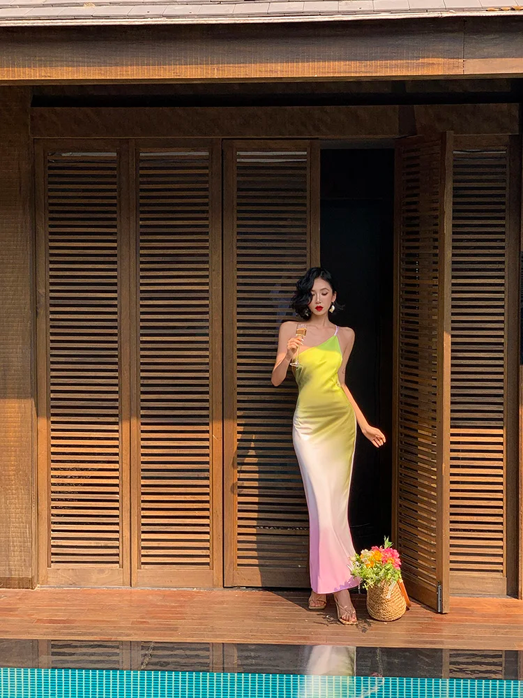 Pink Green Ombre Sheath One Shoulder Satin Long Prom Dress Evening Dress SH4339