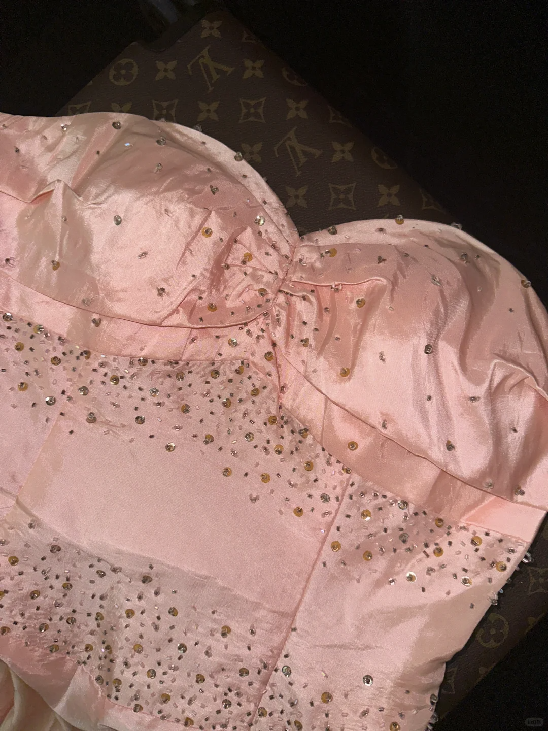 Pink Princess A Line Sweetheart Neck Beaded Satin Long Prom Dress Wedding Guest Dress SH4537