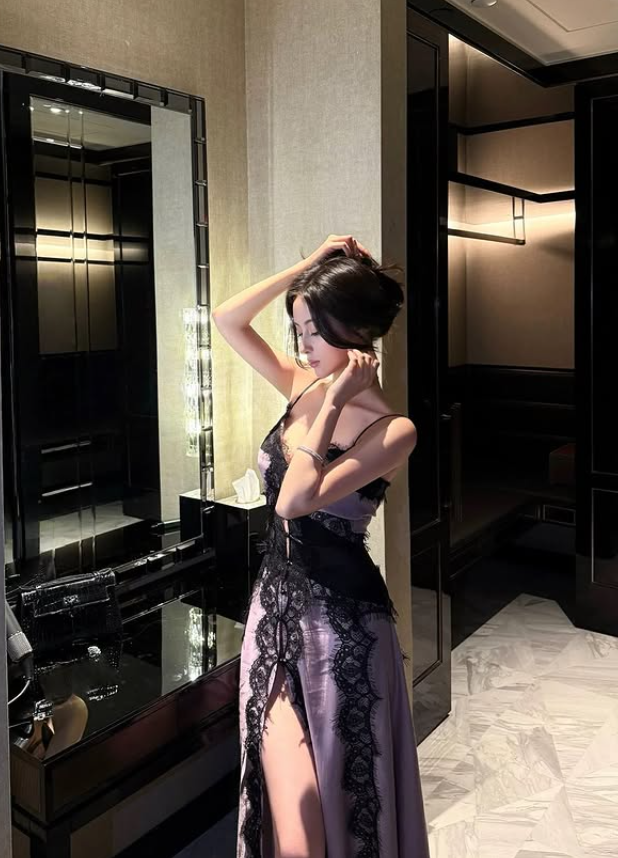 Purple A Line Spaghetti Strap Black Lace Satin Prom Dress with Slit SH5226