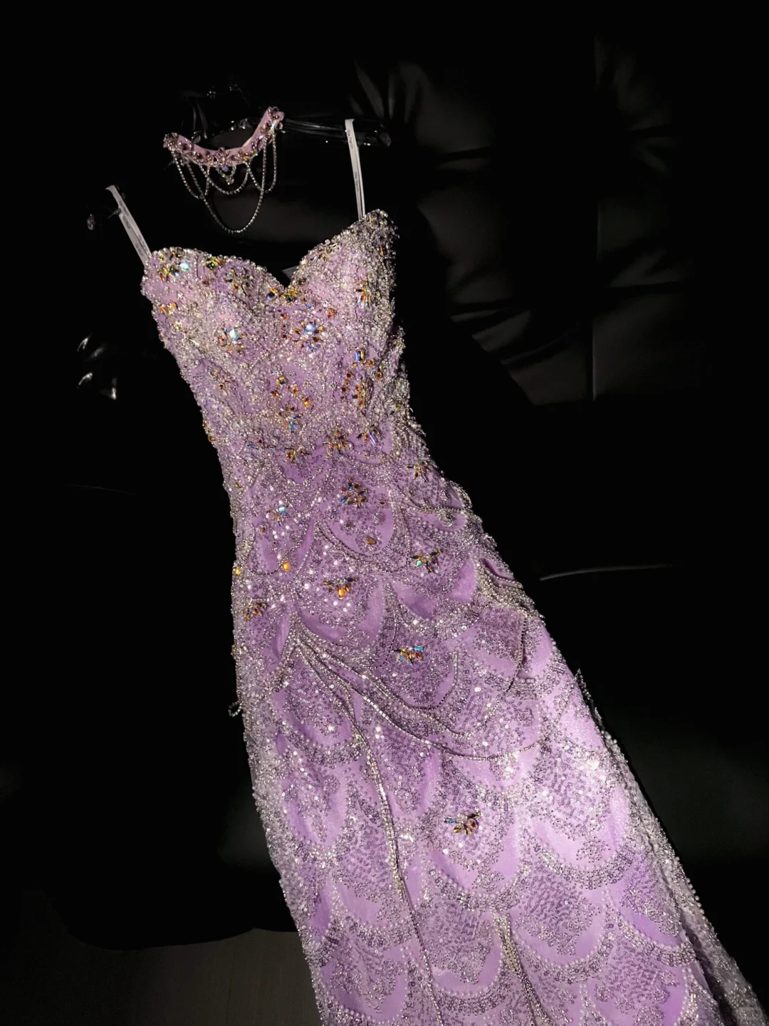 Purple A Line Sweetheart Neck Beaded Sequin Tulle Prom Dress Evening Dress SH3349