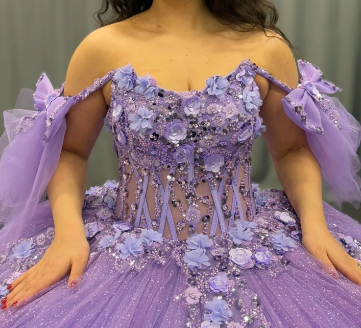 Purple Ball Gown Off the Shoulder Beaded 3D Flowers Sweet 16 Dress Girls Party Gowns vestidos de quinceañera SH3267