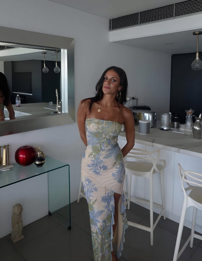 Retro Blue Print Floral Strapless Satin Long Outfit Party Dress 18 Birthday Dress SH3517