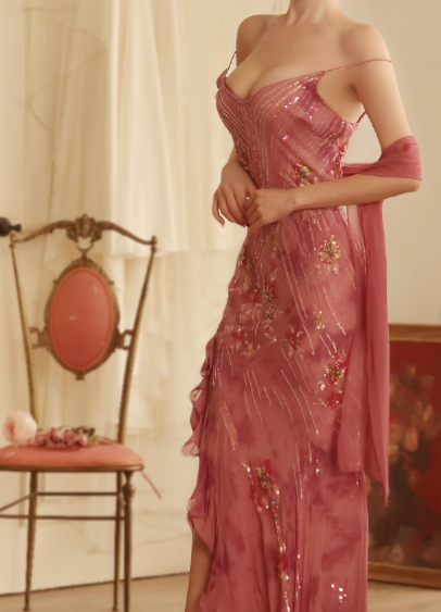 Retro Dreamy Mermaid Pink Print Floral Ruffle Chiffon Long Party Dress Evening Dress Date Dress SH3460