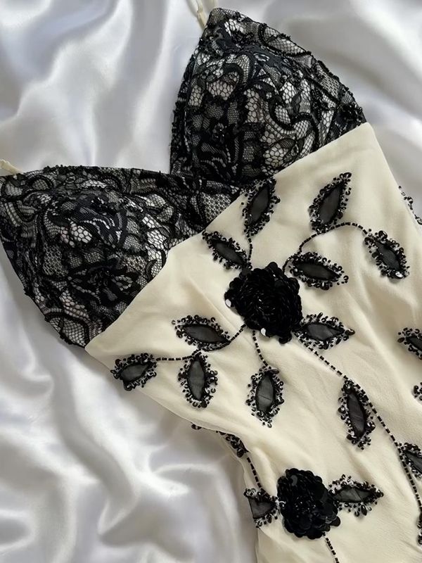 Retro Mermaid Spaghetti Strap Beaded Black Lace Chiffon Prom Dress Date Dress SH3935