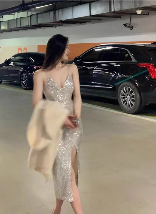 Sexy Sheath Spaghetti Strap Silver Sequin Homecoming Dress Cocktail Dress with Slit SH4060