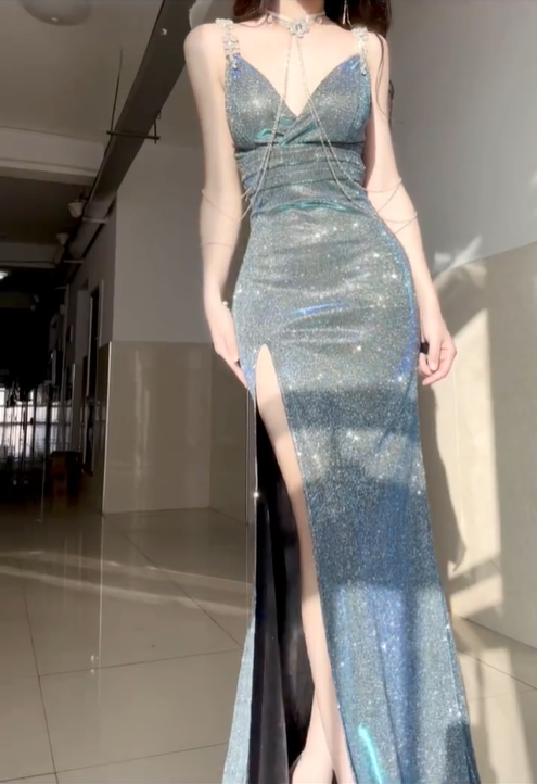 Shiny Blue Mermaid Straps Beaded Sequin Graduation Ball Gown 18th Birthday Dress SH4988