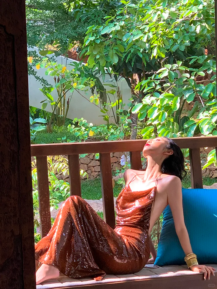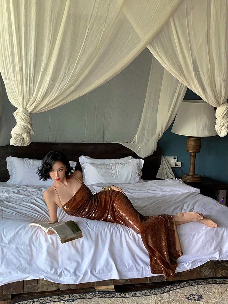 Shiny Brown Mermaid Halter Sequin Open Back Prom Dress Evening Dress SH4350