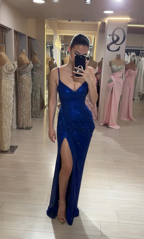 Shiny Sheath V Neck Blue Sequin Long Evening Dress Prom Dress with Slit SH4826