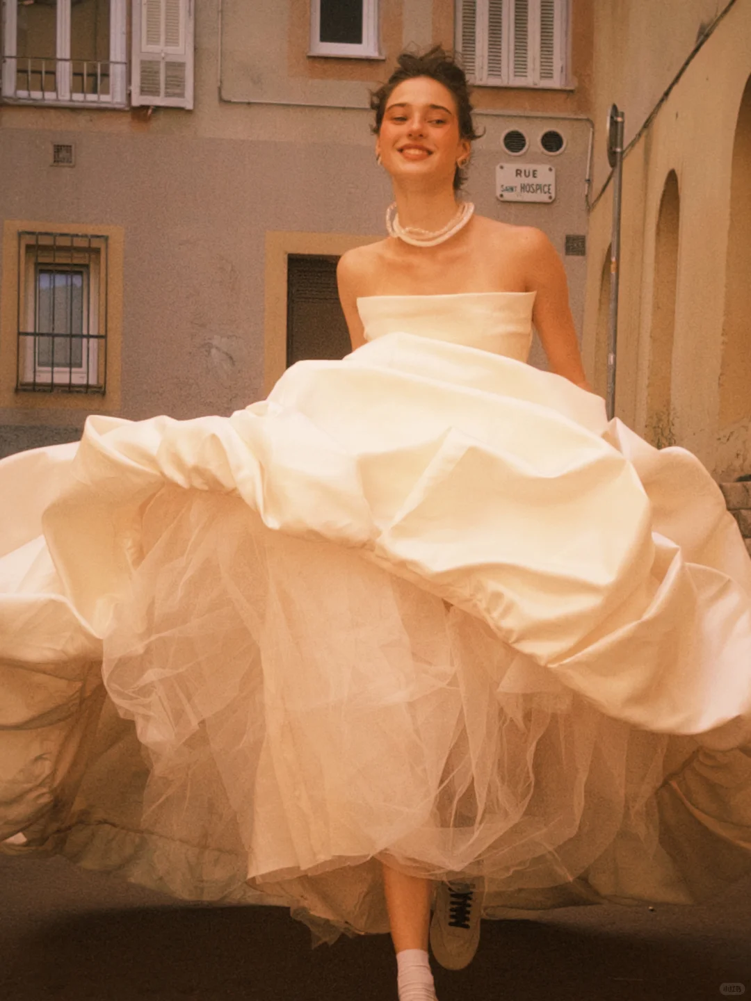 Simple Classic Ball Gown Strapless White Satin Tulle Long Wedding Dress SH5099