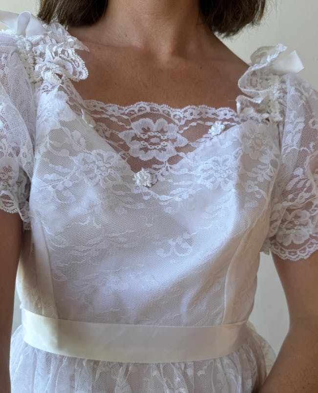 Vintage A Line Puff Layered Beige Lace Long Wedding Dress SH4426
