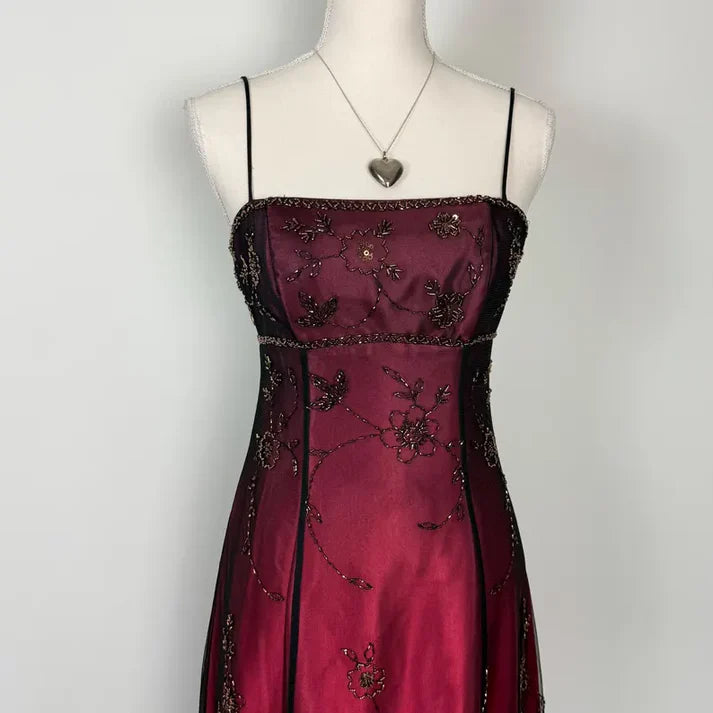 Vintage A Line Spaghetti Strap Beaded Black Chiffon Burgundy Satin Prom Dress Graduation Prom Dress SH2598
