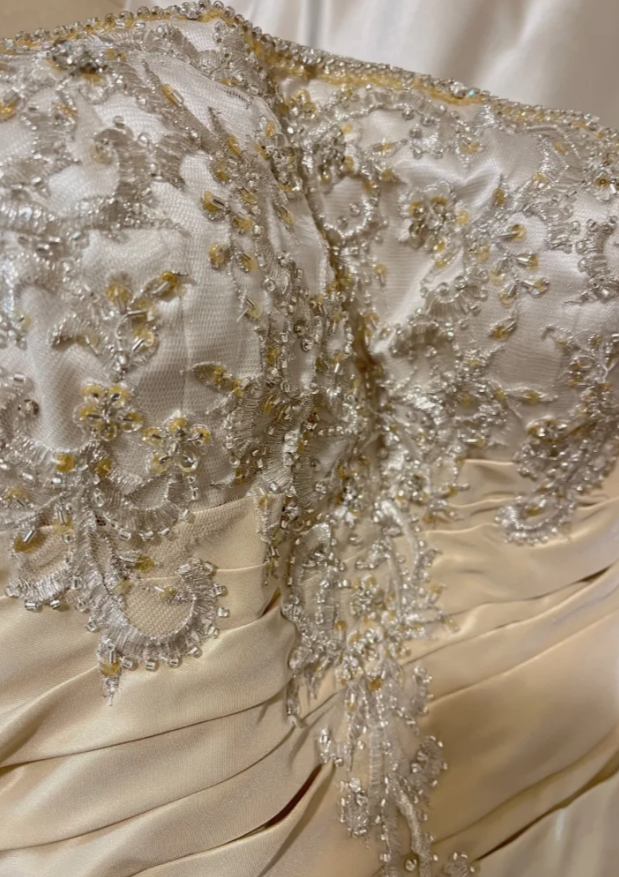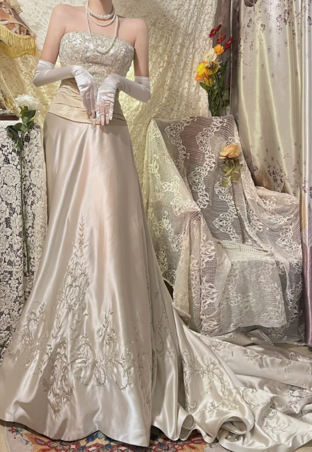 Vintage A Line Strapless Beaded Apricot Satin Prom Dress Wedding Guest Dress SH4653