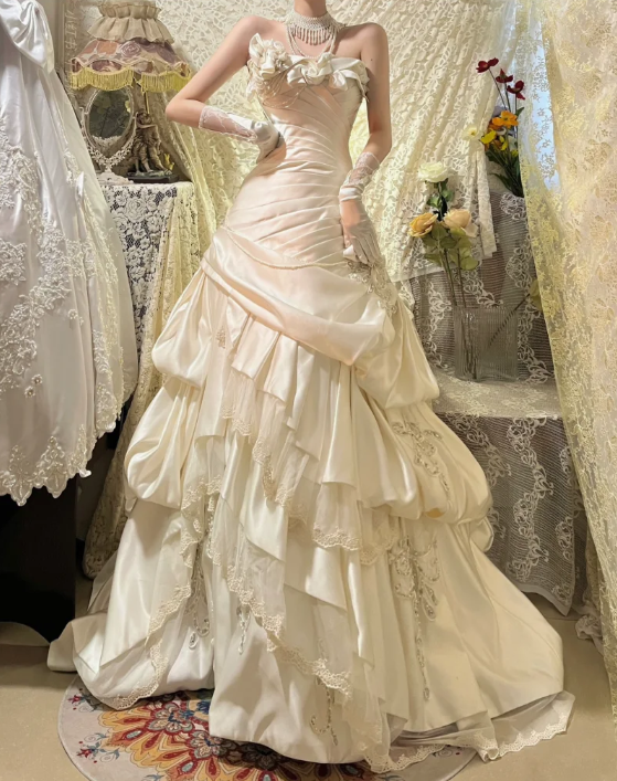 Vintage Ball Gown Strapless Pleated Satin Prom Dresses Wedding Dresses SH4645