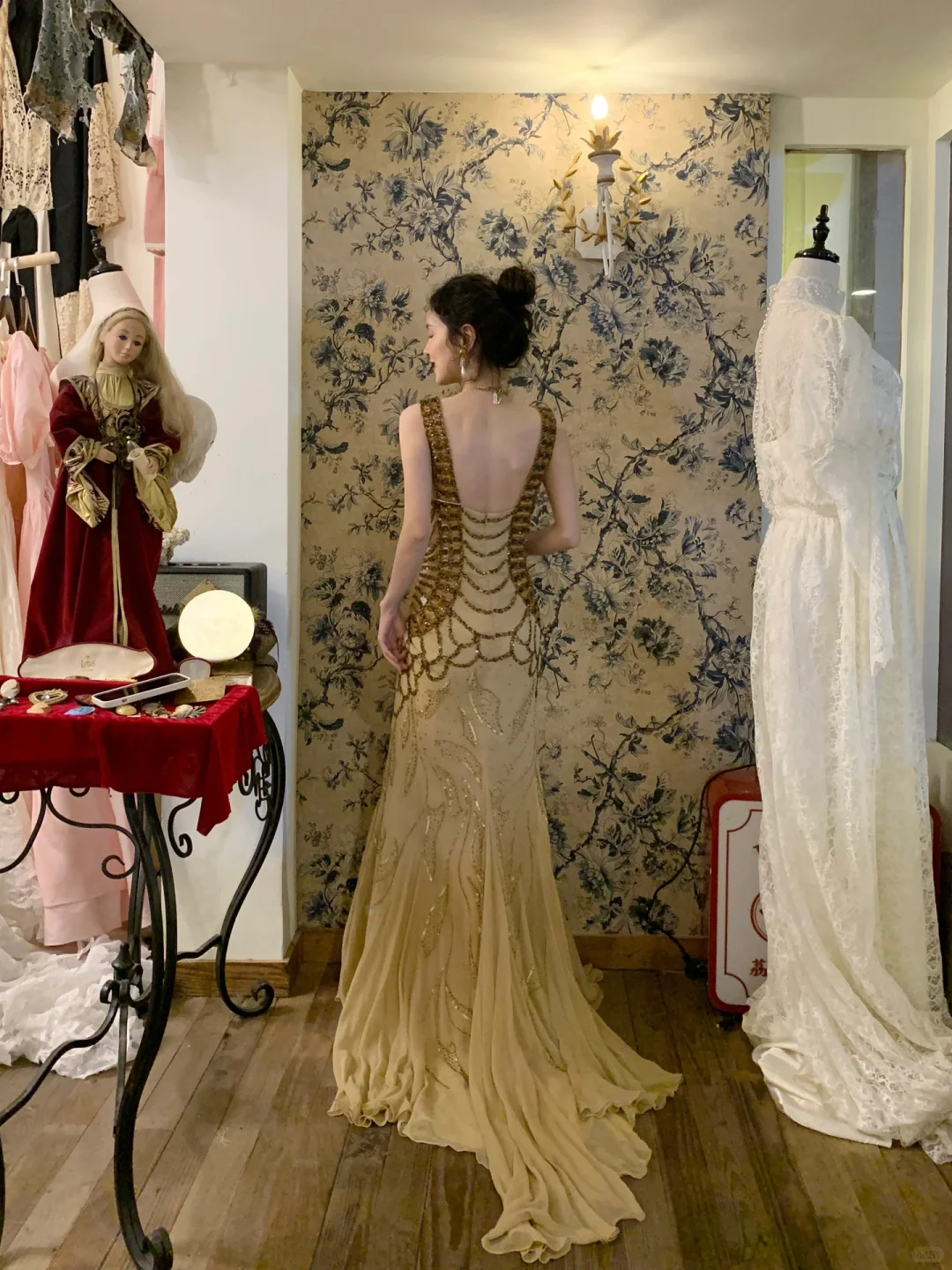 Vintage Exquisite Mermaid Straps Beaded Chiffon Prom Dress Wedding Guest Dress SH4496