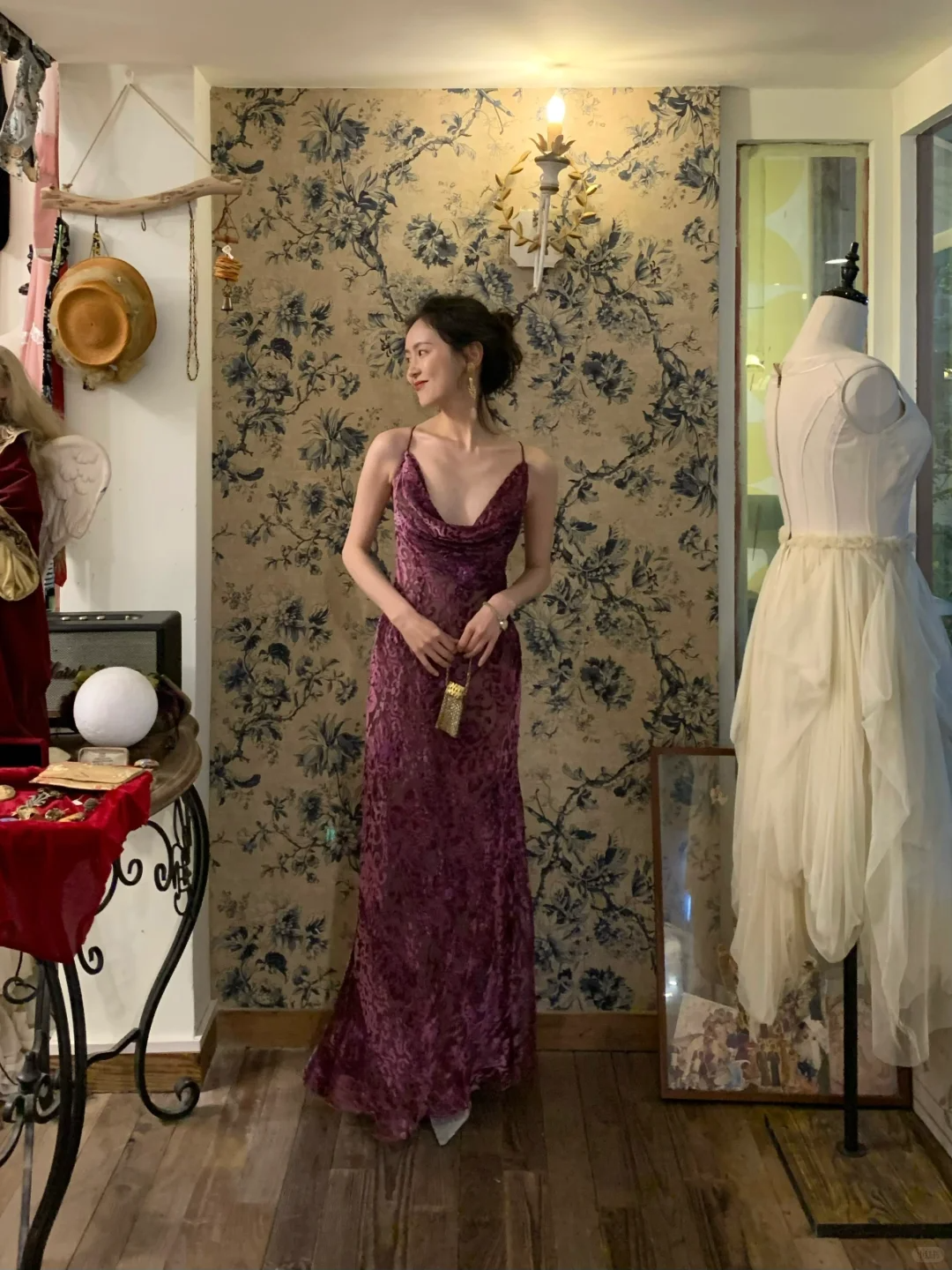 Vintage Purple Mermaid Spaghetti Strap Velvet Open Back Prom Dress 22th Birthday Dress SH4405