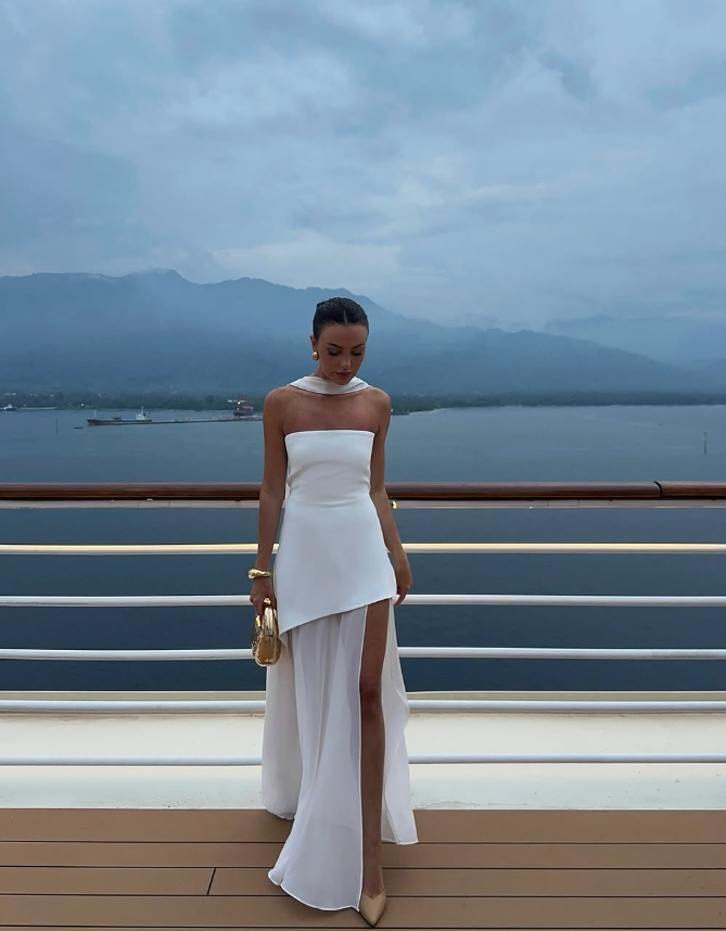 White Flowy Simple A Line Strapless Satin Chiffon Prom Dress Formal Dress with Slit SH3746